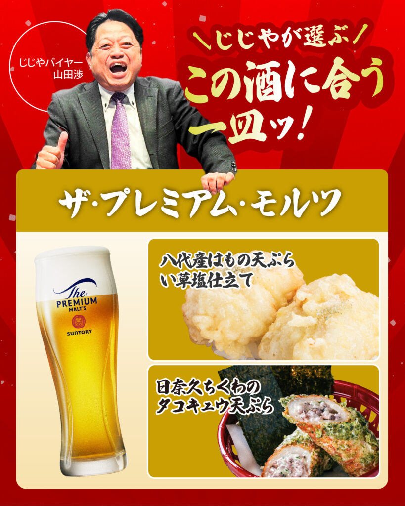 きめ細かな泡と華やかな香りが特徴の「ザ・プレミアム・モルツ」。サクッと揚がった天ぷらの軽やかな食感と、ビールの爽快なのどごしが絶妙にマッチします。八代産はもの上品な旨み、日奈久ちくわの香ばしさを、ビールの苦味が程よく引き締め、後味はすっきり。揚げ物の美味しさをさらに引き立てる王道の組み合わせです。