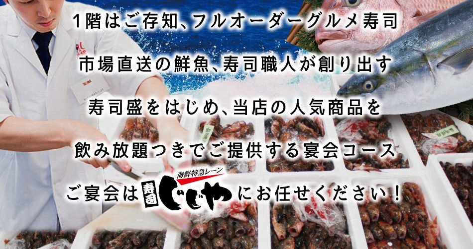 寿司じじやで超・宴・会! じじやの超宴会コース おひとりさま3500円!(前々日まで要予約、4名さまより) お電話にてご予約承ります 寿司じじや 営業時間12:00から23:00 ご予約前にご確認ください コース内容について