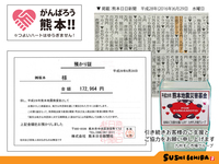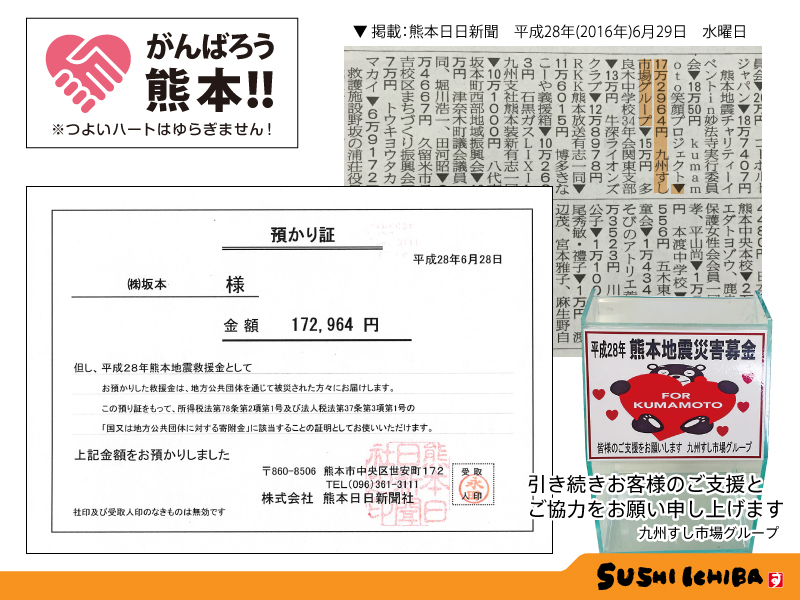 九州すし市場グループ全店に設置しております募金箱に、平成28年6月28日までに皆様からお寄せいただきました募金額「172,964円」 を、株式会社熊本日日新聞社を通じ、平成28年熊本地震救援金としてお渡しさせて頂いたことをご報告いたします。